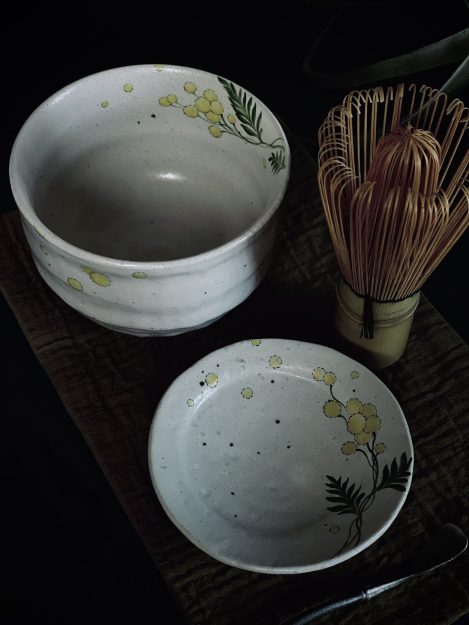 白磁にミモザを描き、お茶を点て、春を味わう――。